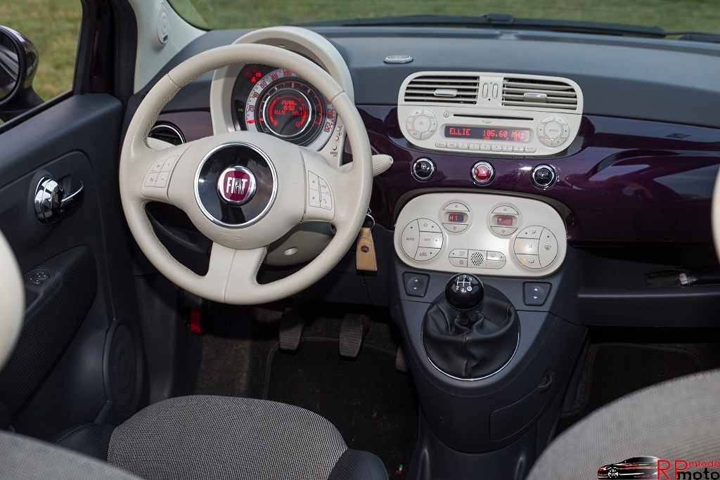 We wnętrzu obu samochodów panuje pogodny, optymistyczny nastrój. Barwa kolorów nie ogranicza się do czarnej deski rozdzielczej i w ramach rozjaśnienia wnętrza jasnego wykończenia tapicerki. W Fiacie deska rozdzielcza była połączeniem koloru śliwkowego, białego i czarnego. Nie mogło również zabraknąć emblematu 500C, wkomponowanego w jej centralną część. Tablica rozdzielcza jest w miarę czytelna. Zegary zostały zintegrowane w jedność. Duży prędkościomierz, lekko poniżej obrotomierz, a w środku cyfrowy wyświetlacz od komutera pokładowego jest dobrym rozwiązaniem pod względem oszczędności miejsca. Jednak do jego czytelności trzeba się przyzwyczaić. Duża kierownica może mieć różne kolory. Często spotyka się o białym obszyciu. Ładnie ona wygląda jednak jest ciężka w utrzymaniu czystości. W testowym egzemplarzu miała ona kolor ciemno beżowy. Tapicerka również nieco nawiązywała do koloru nadwozia ponieważ była to brązowa skóra.